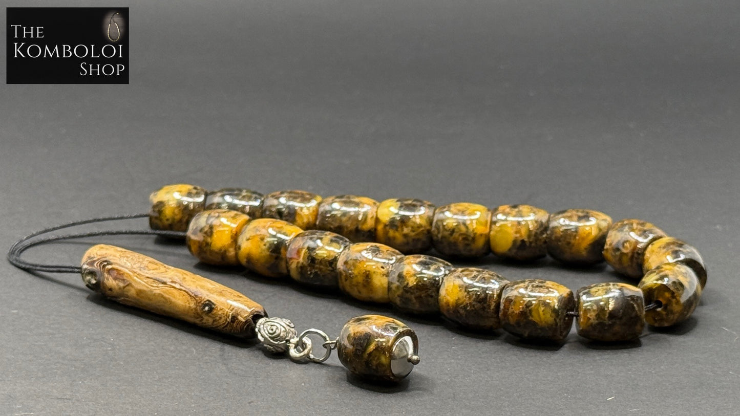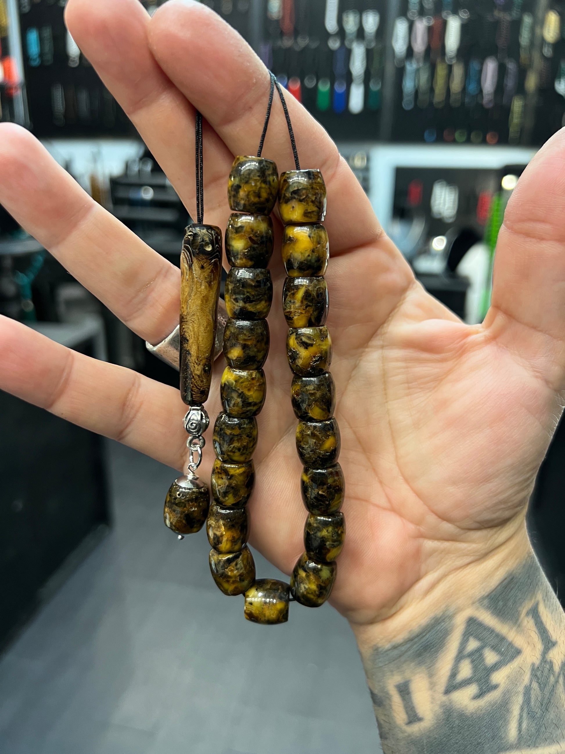 Given the more fragile nature of Amber compared to semi precious stones or bone - An Amber Komboloi is not for hard banging but more a gentle style of dropping the beads on themselves.