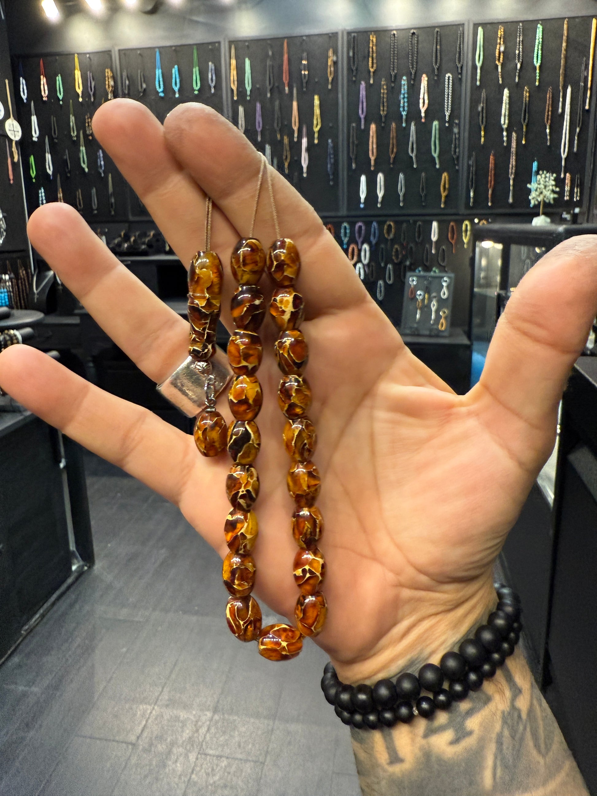 Given the more fragile nature of Amber compared to semi precious stones or bone - An Amber Komboloi is not for hard banging but more a gentle style of dropping the beads on themselves.